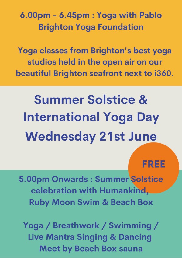 I’ll be teaching a free 45 min class on the seafront, on June 21st, as part of the International Yoga Day celebrations.